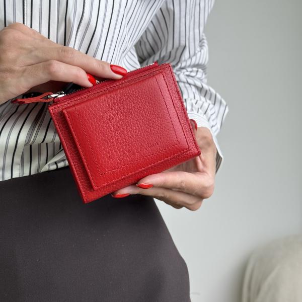 Женский кошелек в насыщенном красном оттенке, выполненный из натуральной зернистой кожи, сочетает элегантность и практичность. Внутри предусмотрены отделения для купюр и карт, чтобы всё необходимое всегда было под рукой. Снаружи находится отделение для монет на молнии и дополнительный карман для карт с быстрым доступом, который закрывается на кнопку. Основное закрытие — на прочную кнопку, обеспечивающую надежность и сохранность содержимого. Компактная квадратная форма и приятная на ощупь натуральная кожа делают этот кошелек стильным аксессуаром на каждый день. Приобрести его можно в нашем магазине — идеальный выбор для тех, кто ценит качество и комфорт.