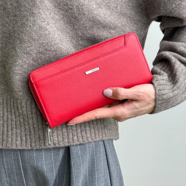 Женский кошелёк из натуральной гладкой кожи в насыщенном красном оттенке — яркий акцент в вашем образе и одновременно практичный аксессуар на каждый день. Основное отделение закрывается на молнию и включает секции для купюр и карман для мелочи. Отдельно предусмотрен отдел для карт на 10 слотов, который фиксируется на магнитные кнопки. Для удобства снаружи расположены два дополнительных кармана: открытый спереди и на молнии сзади — для быстрого доступа к необходимым вещам. Такой кошелёк сочетает современный дизайн и функциональность, становясь незаменимым аксессуаром для женщины, которая ценит качество и комфорт. Приобрести его можно в нашем интернет-магазине — мы предлагаем только стильные и надёжные кожаные модели.