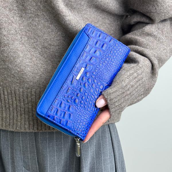 Женский кошелёк из натуральной кожи в насыщенном синем цвете сочетает зернистую фактуру с оригинальным тиснением, что придаёт ему современный и стильный вид. Основное отделение закрывается на молнию и включает секции для купюр и карман для мелочи. Отдельный отдел для карт на 10 слотов фиксируется на магнитные кнопки. Для удобства снаружи предусмотрены два дополнительных кармана: открытый спереди и на молнии сзади — для быстрого доступа к самым необходимым вещам. Такой кошелёк гармонично сочетает функциональность и элегантность, становясь незаменимым аксессуаром в повседневном использовании. Приобрести его можно в нашем интернет-магазине, где представлен большой выбор качественных кожаных изделий.