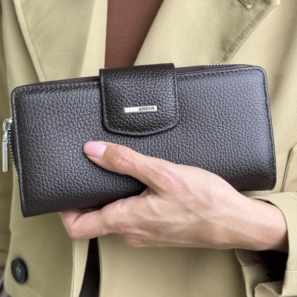 Женский кошелёк в насыщенном шоколадном цвете выполнен из натуральной зернистой кожи, что подчёркивает его стильный вид и придаёт приятную фактуру. Модель сочетает элегантность и практичность: три отделения, включая отдельный отсек на молнии для монет, и 12 слотов для банковских карт помогают удобно организовать вещи. Кошелёк закрывается на скрытый магнит, что делает его использование комфортным и надёжным. Это изысканный аксессуар, который станет практичным спутником в повседневной жизни. В нашем интернет-магазине вы найдёте кошельки из натуральной кожи, сочетающие долговечность и современный дизайн.