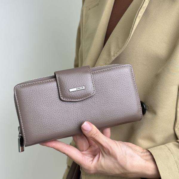 Женский кошелёк в нежном цвете тауп выполнен из натуральной зернистой кожи, которая отличается природной фактурой и приятна на ощупь. Модель сочетает стиль и функциональность: имеет три отделения, включая отдельный отсек на молнии для монет, а также 12 слотов для банковских карт. Благодаря продуманному внутреннему наполнению удобно хранить все необходимые вещи. Кошелёк закрывается на скрытый магнит, что гарантирует надёжность и комфорт в повседневном использовании. Это элегантный аксессуар, который станет практичным дополнением к гардеробу. В нашем интернет-магазине вы найдёте кошельки из натуральной кожи, созданные для комфорта и долговечности.