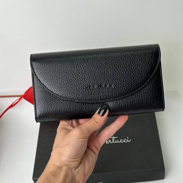 Новинка, кожаный черный кошелек, закрывается на кнопку, есть три отделения, также есть отдельный карман для монет который закрывается на молнию, и три отделения для купюр. Удобный и очень вместительный кошелек из натуральной кожи порадует вас.