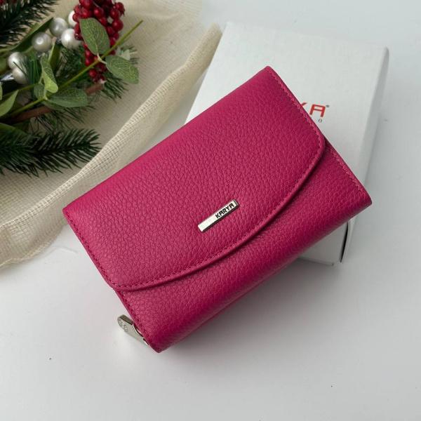 Розовый женский кошелек выполнен из натуральной зернистой кожи. Уникальная особенность этого кошелька в том что он разделен на две части. Одно отделение где сохраняются карты идет спереди и закрывается на магнитную кнопку. Там есть и отделение для бумажных купюр. Отделение для монет находиться сзади и закрывается на молнию. Его можно использовать как и отделение для купюр. Если вам нужен кошелек стильный, удобный, с качественного материала, тогда вы его нашли.