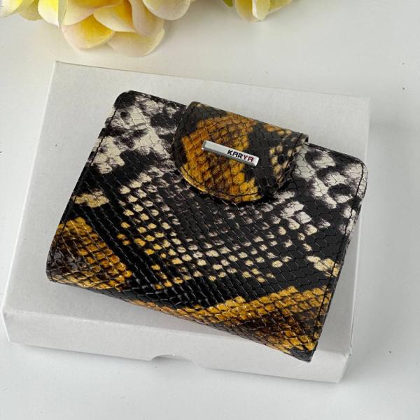 Женский кожаный кошелек в соединении необычных цветов желтого, белого и черного. Снаружи красивое вытеснение, а внутри четкий черный цвет. Кошелек закрывается на кнопку, есть отделения для кредитных карт, также есть отдельный карман для монет который закрывается, и полноценное отделения для купюр. Маленький но очень вместительный кошелек.