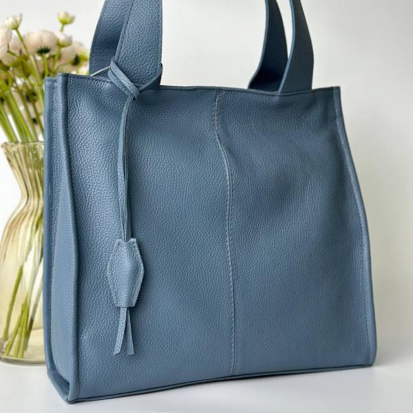Отличный выбор сумки джинсового цвета из натуральной кожи на каждый день. Сумочка вмещает все необходимое для нас девушек. Сумка имеет удобные ручки, поэтому Вы можете носить ее в руке или на плече. Внутри сумки два основных отделения, также есть дополнительные карманы на молнии и без молнии.