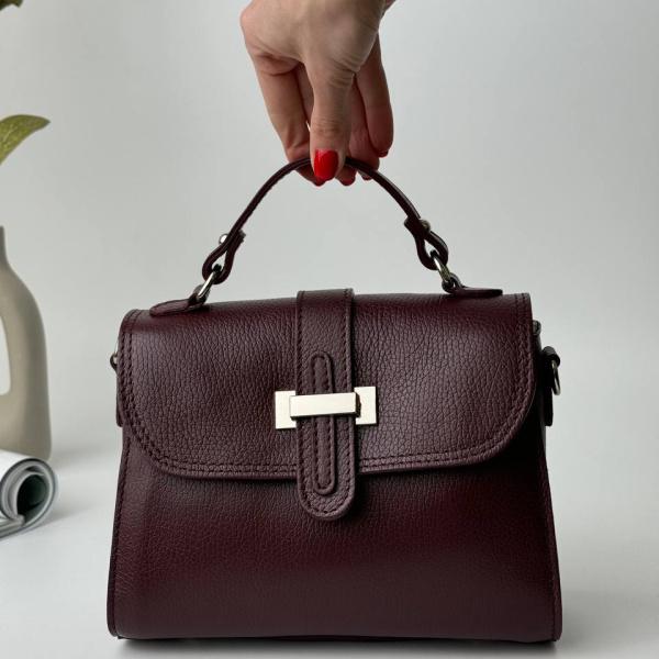 Стильный и практичный вариант на каждый день . Сумочка выполнена з зернистой кожи в цвете марсала. Внутри два основных отделения, которые разделяет карман на молнии. Есть дополнительный карман. Закрывается сумочка на молнию, а сверху клапаном на магнитной кнопке. Сумочку свободно можно носить за короткую ручку. И дополнительно еще есть ремень, он разрешает носить сумку на плече.