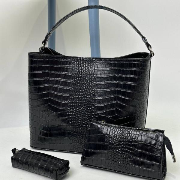 Черный набор, сумочка, косметичка и ключница из натуральной кожи. Сумочка на два отделения, карман на молнии который разделяет сумку и два дополнительных кармана. Сумочку можно носить через плечо, очень удобная и стильная модель. В комплекте плечевой ремень.