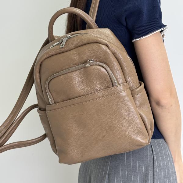 Женский рюкзак из натуральной кожи в универсальном цвете тауп — практичное и стильное решение для повседневного использования. Сдержанный дизайн и продуманная функциональность делают эту модель идеальной для активного ритма жизни. Внутри находится просторное основное отделение, которое закрывается на молнию, а также два дополнительных внутренних кармана — один открытый и один на молнии — для удобной организации вещей. Спереди расположены два внешних кармана: один — на молнии, другой — на магнитной кнопке, что обеспечивает быстрый доступ к самым необходимым вещам. Мягкая округлая ручка позволяет с комфортом носить рюкзак в руке, а регулируемые лямки — за спиной. Приобрести эту модель можно в нашем магазине.