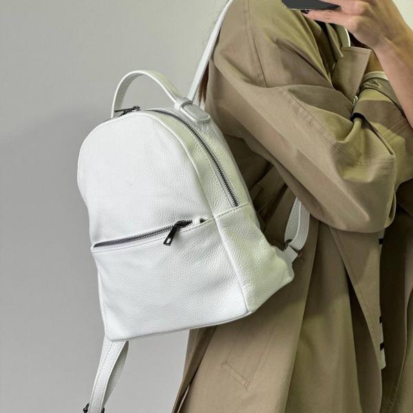 Очень модный белый рюкзак из натуральной кожи который подойдет на каждый день. Внутри одно основное отделения которое закрывается на молнию, также карман на молнии и без.