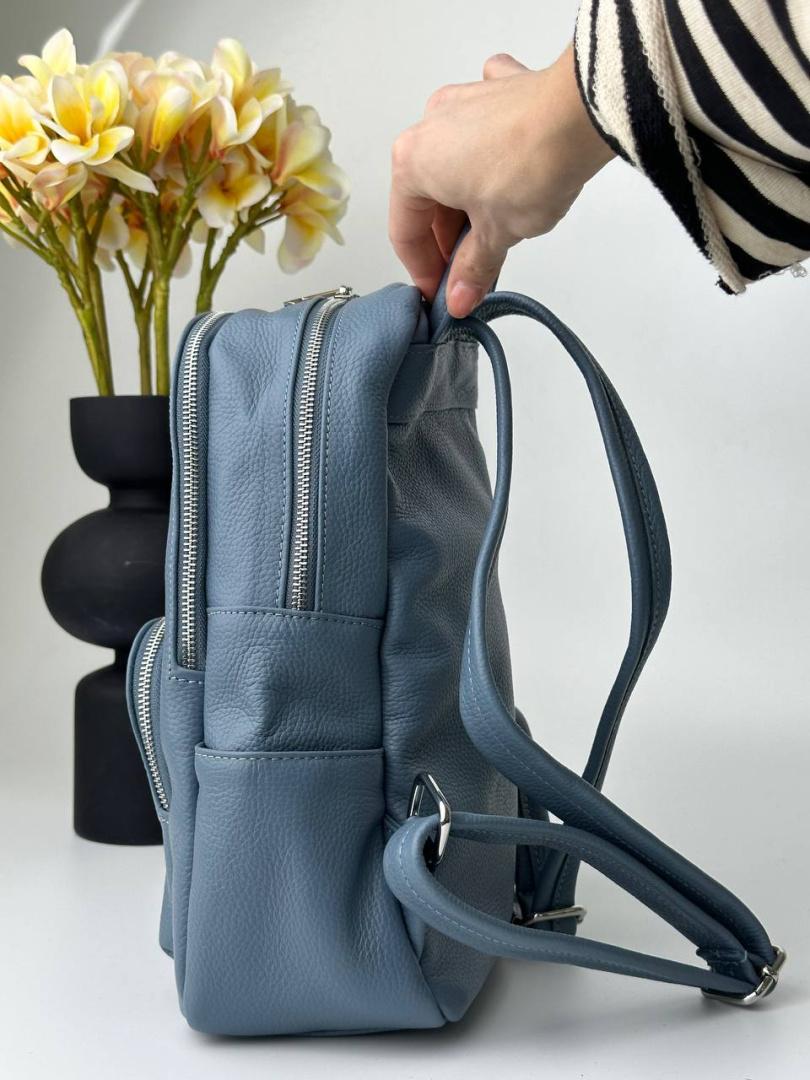 Очень стильный и универсальный рюкзак голубого цвета из натуральной зернистой кожи. Рюкзак имеет два основных отделение, также внутри есть дополнительные карманы на молнии и без. Спереди в данной модели есть карман на молнии, что очень удобно. Закрывается полностью на молнию. Очень удобный и практичный рюкзак на каждый день.