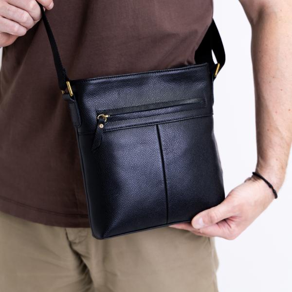 Мужская сумка в универсальном черном цвете — стильный и практичный аксессуар для повседневного использования. Выполнена из натуральной кожи с приятной текстурой, модель имеет одно вместительное основное отделение с двумя дополнительными карманами внутри — открытым и на молнии. Дополнительный карман расположен с внешней стороны сумки и закрывается на молнию, что обеспечивает быстрый доступ к необходимым вещам. Удлиненный регулируемый ремень позволяет носить сумку на плече или через плечо, обеспечивая комфорт при ношении. Отличный выбор как для повседневного, так и для делового стиля. Эта модель доступна в нашем магазине.