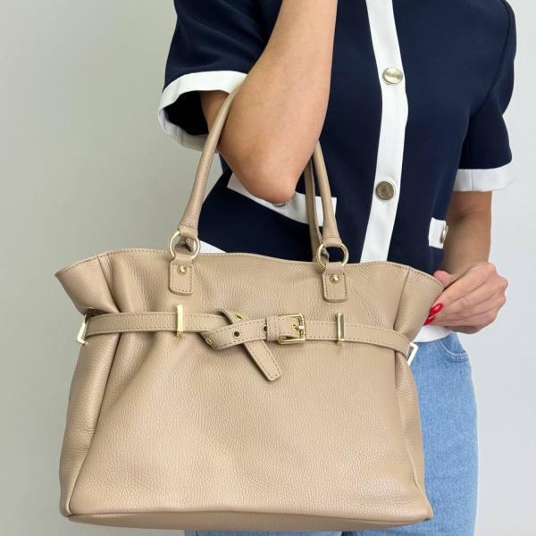 Женская сумочка в бежевом цвете из натуральной зернистой кожи — изысканный аксессуар, который удачно сочетает в себе стиль и практичность. Модель оснащена вместительным основным отделением, внутренним карманом на молнии и двумя открытыми кармашками для удобной организации вещей. Сумочка надежно закрывается на молнию. Удлинённый регулируемый ремень позволяет комфортно носить её на плече, а удобные ручки — в руке. Декоративный ремешок добавляет акцент и позволяет регулировать объём сумки в зависимости от ваших потребностей. Приобрести эту универсальную модель можно в нашем магазине — отличное дополнение к вашим повседневным образам.