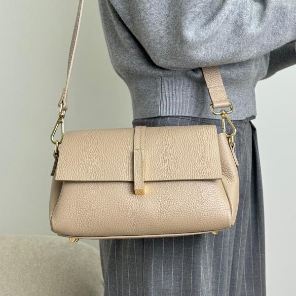 Женская сумочка в изысканном бежевом цвете, выполненная из натуральной зернистой кожи, сочетает в себе элегантность и практичность. Модель имеет три отдельных отделения для удобной организации пространства, а также внутренний карман на молнии для самых необходимых мелочей. Сумка закрывается на молнию и дополнительно фиксируется клапаном с замком, обеспечивая надежность в использовании. Удлинённый регулируемый ремень позволяет удобно носить её через плечо или на плече, а золотая фурнитура добавляет утончённого блеска. Приобрести эту стильную и универсальную модель можно в нашем интернет-магазине — отличный выбор для женщин, ценящих качество, комфорт и современный дизайн.