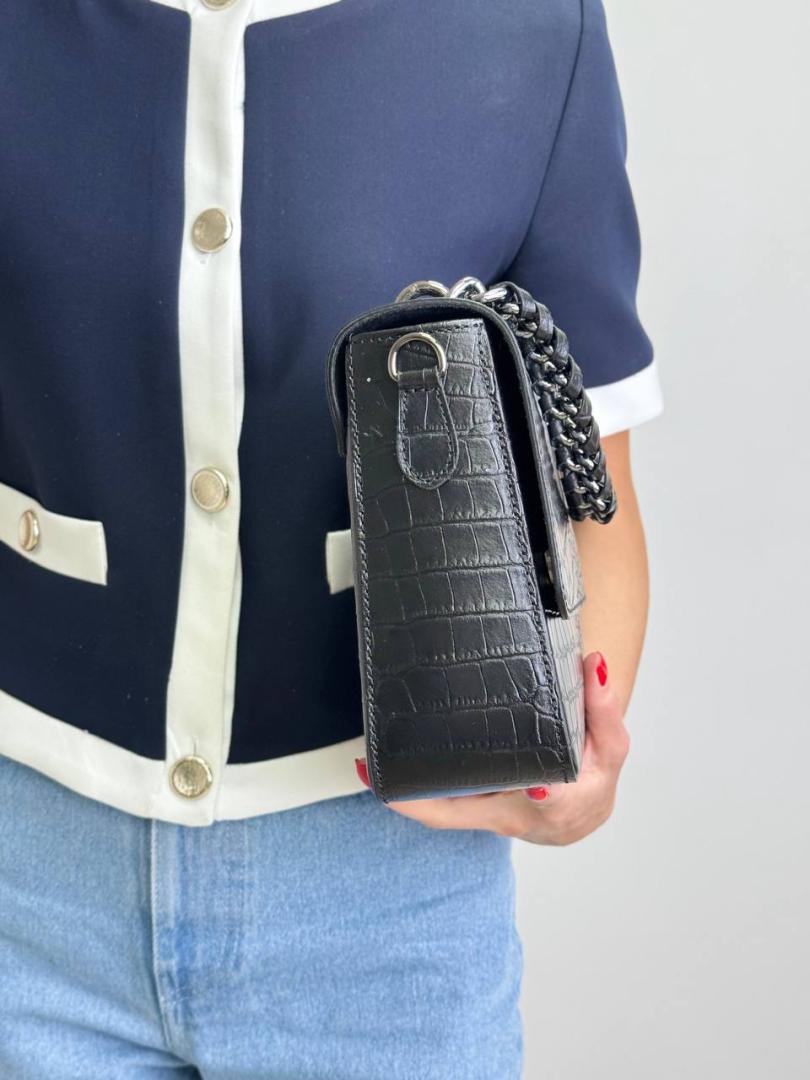 Женская сумочка в глубоком чёрном цвете — изысканное сочетание современного дизайна и практичности. Модель выполнена из натуральной кожи с деликатным тиснением, которое придаёт фактурности и визуальной глубины. Внутри — просторное основное отделение и удобные карманы: одна на молнии и открытая для мелочей. Сумка надежно закрывается на молнию и дополнительно фиксируется клапаном с магнитами. Оригинальная ручка, выполненная в комбинации цепи и кожи, делает аксессуар особенно выразительным. А удлинённый регулируемый ремень позволяет носить её на плече или через плечо — как вам удобно. Приобрести эту стильную и характерную модель можно в нашем магазине — выбор, который подчёркивает ваш вкус.
