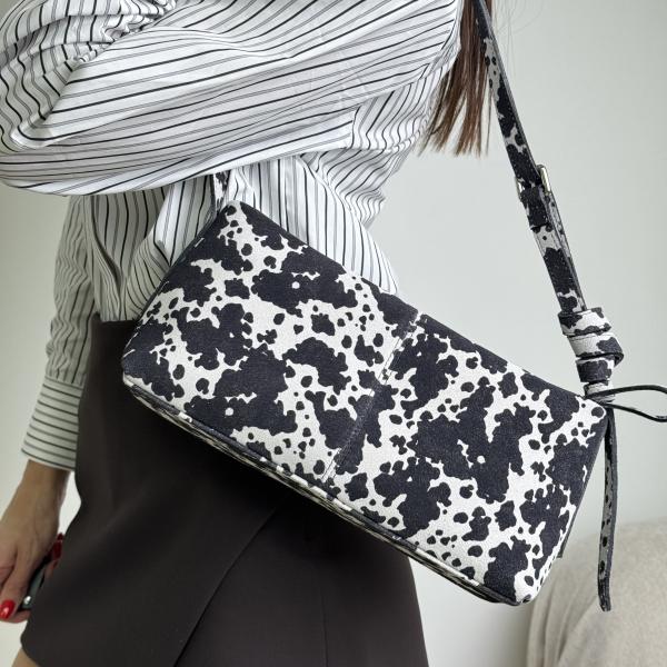 Сумка из натуральной замши в чёрно-белом сочетании выглядит стильно и эффектно. Лаконичный принт добавляет модели выразительности и делает её ярким акцентом в любом образе. Это наш авторский пошив, созданный с учётом комфорта и практичности. Внутри — просторное отделение, карман на молнии и два открытых кармана для удобного хранения необходимых вещей. Благодаря регулируемому ремню сумку легко носить на плече или через плечо. Приобрести эту элегантную модель можно в нашем магазине — стильное дополнение для современной женщины.