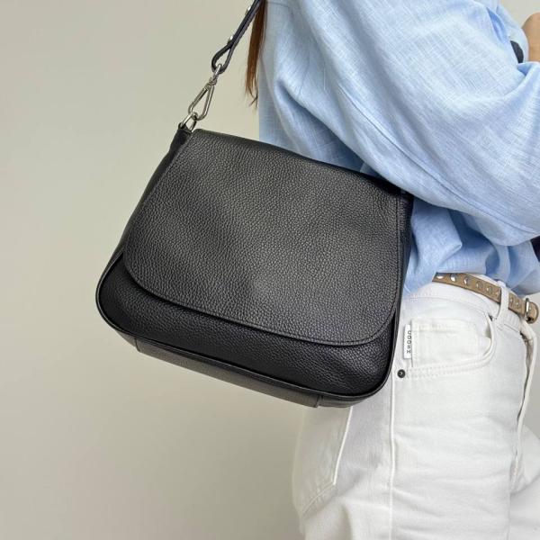 Женская сумочка в классическом черном цвете — удачное сочетание элегантности и практичности. Сдержанный дизайн и удобная форма делают её универсальным вариантом для любого гардероба. Модель имеет одно основное отделение, а также дополнительные карманы — на молнии и открытого типа — для удобного хранения мелочей. Сумка надежно закрывается на молнию и сверху фиксируется клапаном с магнитной кнопкой. Удлинённый регулируемый ремешок позволяет носить её как на плече, так и через плечо. В нашем магазине вы можете купить эту модель из натуральной кожи — стильный выбор на каждый день.