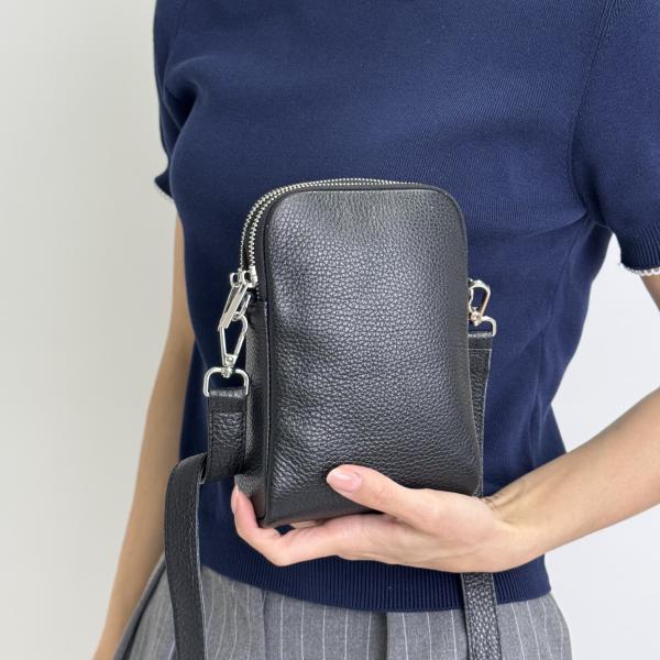 Сумка из натуральной кожи в насыщенном чёрном цвете — стильное решение для повседневного образа. Несмотря на компактный размер, модель отличается продуманной функциональностью: два отдельных отделения на молнии позволяют удобно организовать все необходимые вещи. Регулируемый ремень даёт возможность носить сумку как на плече, так и через плечо, обеспечивая комфорт в динамичном ритме дня. Лаконичный дизайн, элегантный оттенок и высокое качество исполнения делают эту модель универсальным аксессуаром, который вы можете приобрести в нашем магазине.