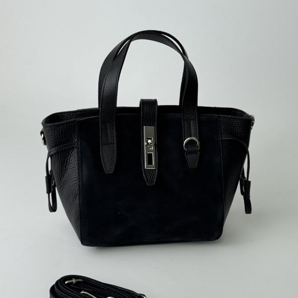 Сумка в классическом чёрном цвете — стильное решение на каждый день. Сочетание натуральной кожи и замши придаёт модели выразительную текстуру и глубину. Аккуратная трапециевидная форма делает её изысканной, а одно вместительное отделение дополнено двумя внутренними карманами — открытым и на молнии — для удобного размещения необходимых вещей. Сумка надёжно закрывается на молнию и дополнительно фиксируется поворотным замком. Удобные короткие ручки и удлинённый регулируемый ремень позволяют носить её так, как вам комфортно. Модель доступна в нашем магазине.
