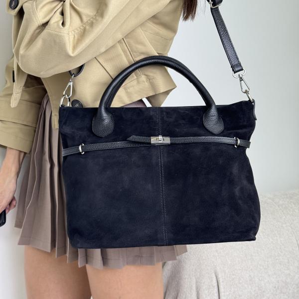 Женская сумочка в классическом черном цвете — стильное сочетание натуральной зернистой кожи и мягкой замши. Эта элегантная модель гармонично дополнит любой образ. Внутри предусмотрено просторное отделение с карманами: открытым и на молнии, что позволяет удобно организовать все необходимые вещи. На обратной стороне расположено дополнительное отделение на молнии для быстрого доступа. Спереди сумочку украшает декоративный ремешок, который одновременно регулирует объем и придает изысканный акцент. Удобные ручки и удлиненный регулируемый ремень позволяют носить модель в руке или на плече. Приобрести эту универсальную сумочку можно в нашем магазине — отличный выбор для тех, кто ценит стиль и практичность.