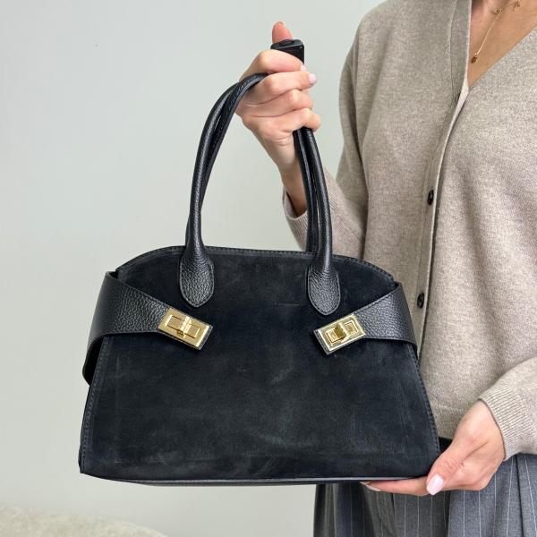 Женская сумка в классическом черном цвете выполнена из сочетания натуральной зернистой кожи и мягкой замши, что создаёт стильный контраст фактур и придаёт аксессуару элегантный вид. Модель имеет одно просторное основное отделение и открытую внутреннюю карман для самых необходимых вещей. Декоративный ремешок спереди не только украшает сумку, но и позволяет регулировать её объём. Благодаря длинным ручкам и дополнительному регулируемому ремню модель удобно носить как в руке, так и на плече. Золотая фурнитура добавляет утончённости, подчёркивая современный стиль изделия. Приобрести эту элегантную сумку можно в нашем интернет-магазине — идеальный выбор для женщин, которые ценят качество и внимание к деталям.