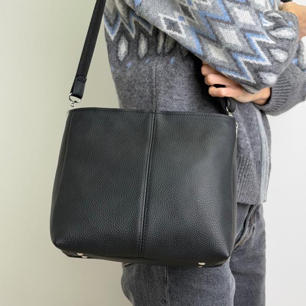 Женская сумочка из натуральной зернистой кожи в классическом чёрном цвете — стильный и универсальный аксессуар, выполненный в Украине из высококачественной итальянской кожи. Модель имеет одно основное отделение, а также два дополнительных кармана — открытый и на молнии, которые позволяют удобно разместить необходимые мелочи. Снаружи сзади расположён практичный карман на молнии для быстрого доступа к самым важным вещам. Сумочка дополнена серебристой фурнитурой и защитными металлическими ножками, которые помогают сохранять форму изделия и продлевают срок его службы. Удлинённый съёмный регулируемый ремень обеспечивает комфортное ношение на плече или через плечо, делая модель идеальной для ежедневного использования. Приобрести эту стильную сумочку из натуральной итальянской кожи вы можете в нашем магазине — отличный выбор для женщин, которые ценят качество, элегантность и современный дизайн.