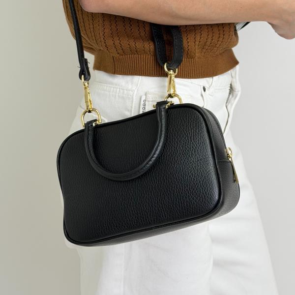 Женская сумка в глубокому чёрном цвете выполнена из натуральной зернистой кожи и имеет лаконичный, универсальный дизайн. Благодаря продуманному компактному формату модель удобна в повседневном использовании и легко вмещает всё самое необходимое. Основное отделение дополнено внутренним карманом на молнии, который помогает поддерживать порядок внутри. Сумка имеет короткие ручки для элегантного ношения в руке, а также регулируемый ремень, обеспечивающий комфорт при использовании. Золотая фурнитура создаёт стильный контраст и подчёркивает современный характер модели. Приобрести эту практичную и стильную сумку можно в нашем магазине — идеальное решение для повседневных образов.