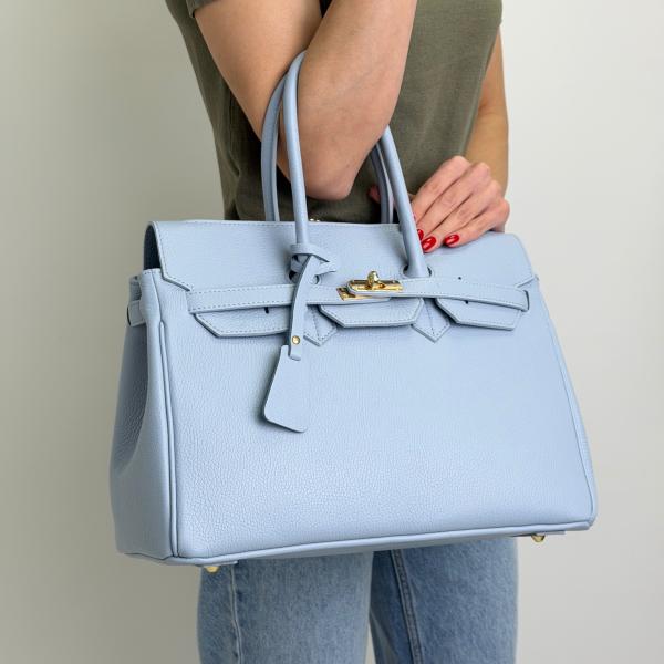 Женская сумочка в насыщенном голубом цвете из натуральной зернистой кожи — стильный и практичный аксессуар, который сочетает элегантность и комфорт. Внутри предусмотрено просторное основное отделение с двумя карманами — открытым и на молнии — для удобной организации всех необходимых мелочей. Модель закрывается клапаном с замком, а дополнительная молния сверху обеспечивает быстрый доступ к содержимому. Золотистая фурнитура и ножки придают аксессуару изысканный блеск и помогают сохранить аккуратный вид. Длинные ручки позволяют носить сумочку как в руке, так и на плече. Приобрести эту элегантную модель вы можете в нашем магазине — идеальное сочетание стиля, практичности и качества.