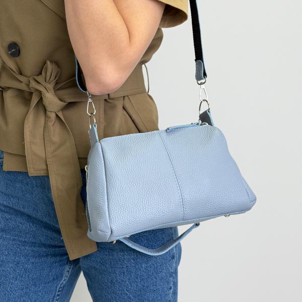 Женская сумочка в насыщенном голубом оттенке из натуральной зернистой итальянской кожи — изысканное сочетание качества, функциональности и современного дизайна. Модель изготовлена в Украине с особым вниманием к деталям, что подчёркивает её стильный характер и практичность в повседневном использовании. Сумка имеет два отдельных отделения на молниях, позволяя удобно организовать все необходимые вещи, а внутри предусмотрены три кармана — два открытых и один на молнии — для ещё большего удобства. Снаружи расположены три функциональных кармана на молниях: один сзади и два по бокам, благодаря чему всё самое нужное всегда под рукой. Серебристая фурнитура гармонично дополняет сдержанный дизайн, а металлические ножки помогают сохранять форму сумки и её аккуратный внешний вид. В комплект входят два ремня — короткий для ношения в руке и удлинённый регулируемый, позволяющий комфортно носить аксессуар на плече или через плечо. Приобрести эту стильную модель можно в нашем интернет-магазине — идеальный выбор для тех, кто ценит качество итальянской кожи и современное украинское производство.