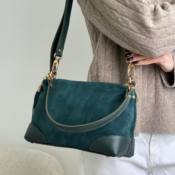 Сумочка насыщенного смарагдового цвета из натуральной замши — стильный и практичный аксессуар для современного образа. Модель имеет три основных отделения, в центральном из которых предусмотрены два дополнительных кармана — открытый и на замке для мелочей. Сзади расположен внешний карман на молнии для быстрого доступа. Для удобства ношения предусмотрены два ремня: короткий для руки и длинный, регулируемый для ношения на плече или через плечо. Декоративная кисточка дополняет образ, а золотая фурнитура подчеркивает элегантность модели. Приобрести эту сумочку можно в нашем магазине — стиль и комфорт для современной женщины.