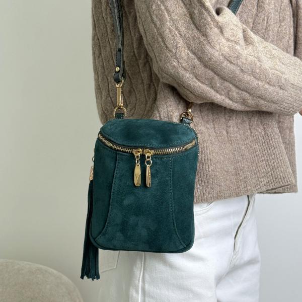 Женская сумочка из натуральной замши в глубоком изумрудном цвете — элегантный аксессуар, сочетающий стиль и удобство. Два отдельных отделения на молниях обеспечивают продуманную организацию пространства, позволяя удобно разместить все необходимые вещи. Благодаря удлинённому регулируемому ремню сумку можно комфортно носить на плече или через плечо, легко адаптируя под ваш ритм жизни. Изысканная модель, которая станет гармоничным дополнением любого образа — представлена в нашем магазине.