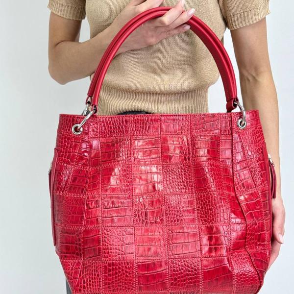 Женская сумка из натуральной кожи в насыщенном красном цвете — эффектный акцент в вашем гардеробе. Дизайн выполнен с использованием двух видов тиснения, что придаёт модели элегантность и глубину. Вместительная и удобная, сумка оснащена двумя основными отделениями, разделёнными центральным карманом на молнии, а также дополнительными внутренними: открытым и на молнии. По бокам расположены внешние карманы на молниях для быстрого доступа к мелочам. Удобные ручки обеспечивают комфорт при ношении в руке. Приобрести эту стильную модель вы можете в нашем магазине — идеальный выбор для активных и уверенных в себе женщин.