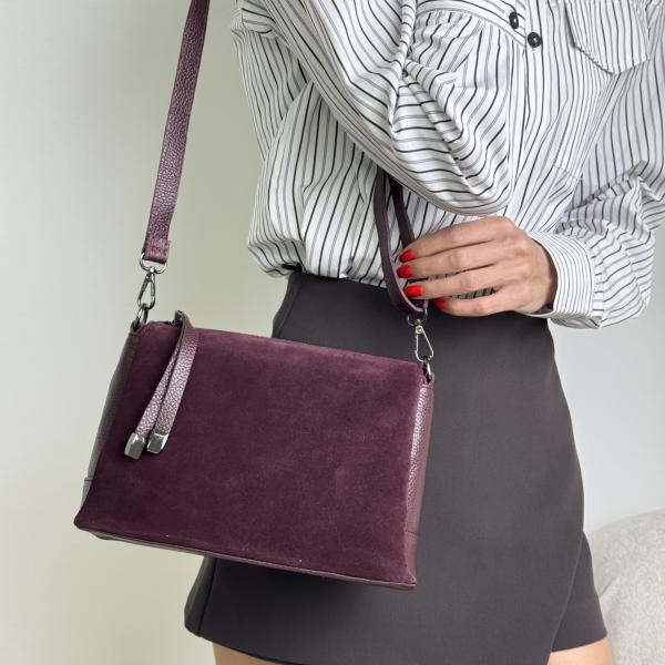 Элегантная женская сумочка в модном оттенке марсала сочетает две текстуры — нежную замшу и зернистую кожу, создавая изысканный образ. Несмотря на компактный размер, модель остаётся очень вместительной и удобной для повседневного использования. Внутри три отдельных отделения для аккуратной организации вещей, а сзади предусмотрен дополнительный карман на молнии. В комплекте идёт регулируемый плечевой ремень, который обеспечивает максимальный комфорт при ношении. Заказывайте эту стильную модель в нашем магазине и подчеркните свою индивидуальность!