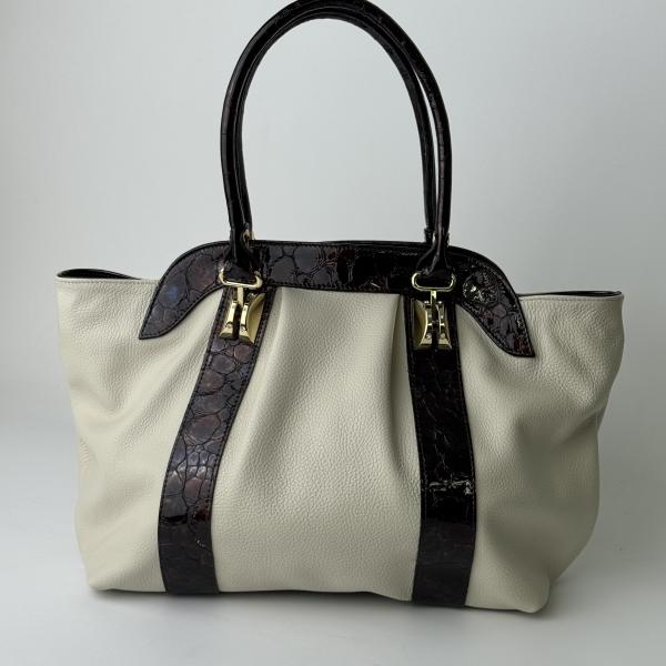 Сумка из натуральной кожи в молочном цвете — стильная модель с выразительными вставками цвета марсала с перфорацией. Контрастные акценты придают изделию оригинальности и элегантности. Два вместительных отделения, разделённых центральным карманом на молнии, обеспечивают удобную организацию пространства. Дополнительные внутренние карманы — один на молнии и один открытого типа — позволяют удобно разместить все необходимые мелочи. Благодаря удлинённым ручкам сумку комфортно носить как в руке, так и на плече. Приобрести эту оригинальную модель можно в нашем магазине.