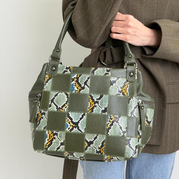 Женская сумка в благородном оливковом цвете выполнена из натуральной кожи в стильном сочетании зернистой фактуры и кожи с выразительным принтом, что придаёт модели глубину и современный характер. Дизайн сформирован из отдельных элементов, создающих интересный фактурный эффект и подчёркивающих оригинальность изделия. Сумка имеет три отдельных основных отделения, каждое из которых закрывается на молнию, что обеспечивает удобную и продуманную организацию пространства. В центральном отделении предусмотрены дополнительные карманы — один открытый и один на молнии — для аккуратного хранения необходимых вещей. Снаружи, на обратной стороне и по бокам, расположены практичные карманы для быстрого доступа. Удлинённые ручки позволяют комфортно носить сумку как в руке, так и на плече. Серебристая фурнитура гармонично дополняет дизайн и подчёркивает стиль модели. Приобрести эту элегантную сумку можно в нашем магазине — отличный выбор для повседневного использования.