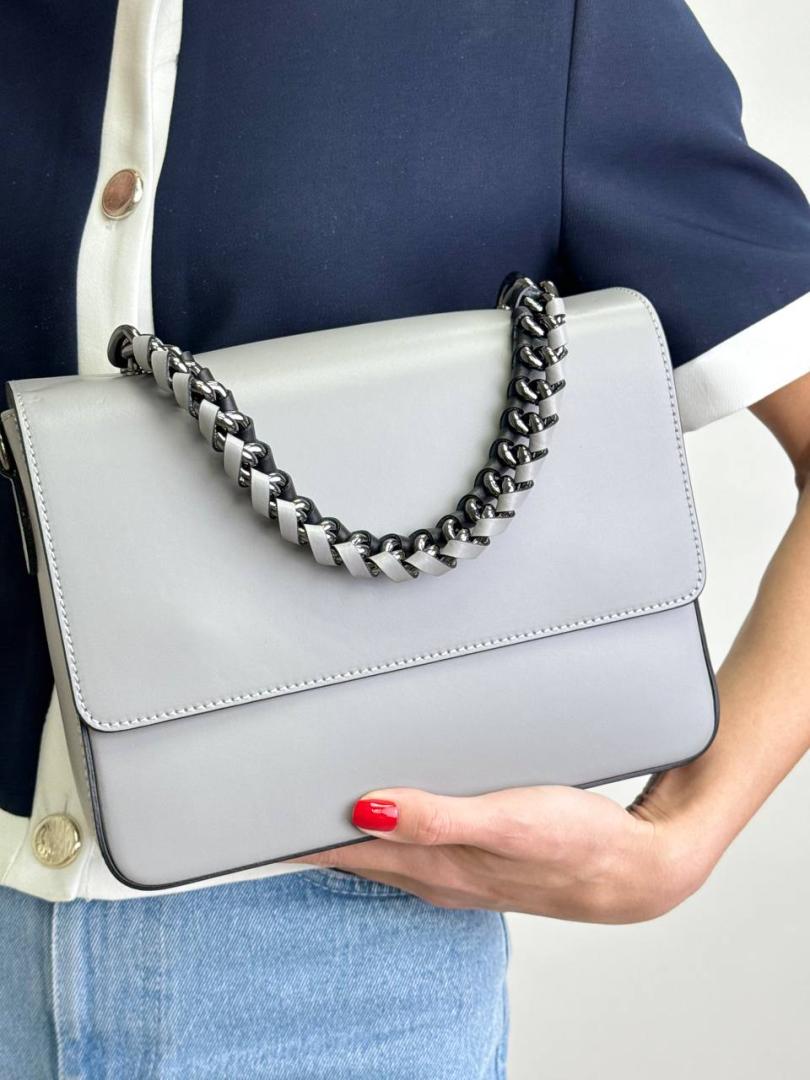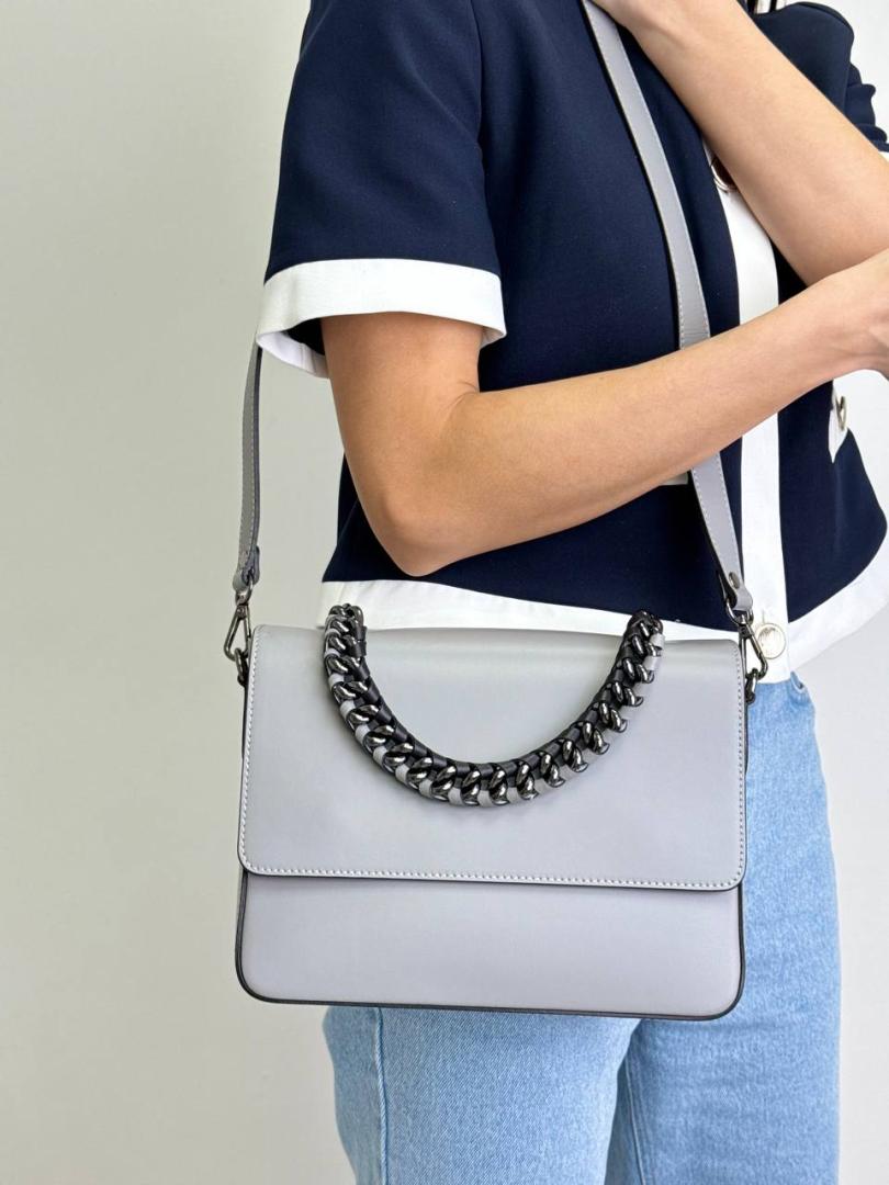 Сумка в сером цвете — стильное дополнение, которое легко сочетается с разными образами. Модель выполнена из натуральной гладкой кожи с приятной текстурой, которая придаёт образу особую элегантность. Внутри — просторное основное отделение, карман на молнии и один открытый карман для удобного хранения необходимых мелочей. Сумка надёжно закрывается на молнию, а сверху дополнительно фиксируется клапаном на магнитах для большей безопасности. Необычная ручка в сочетании кожи и металлической цепи придаёт модели современный акцент. Также в комплекте — удлинённый регулируемый ремень, чтобы вы могли носить сумку так, как удобно именно вам. Стиль, комфорт и качество — всё это вы найдёте в нашем магазине.