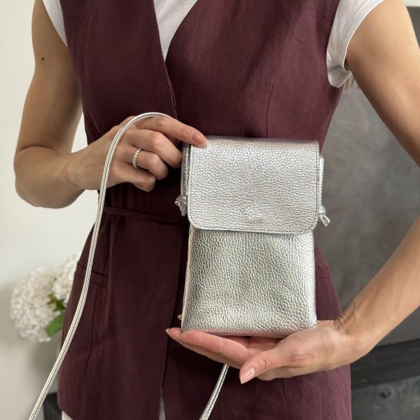 Компактная женская сумка в изысканном серебристом цвете выполнена из натуральной зернистой кожи — стильное и практичное решение на каждый день. Модель оснащена одним основным отделением, которое надежно закрывается на молнию и дополнительно фиксируется клапаном с магнитной кнопкой. Под клапаном находится открытый карман для быстрого доступа к необходимому, а на обратной стороне — внешний карман на молнии. Сумка дополнена удлинённым ремнём для удобной носки через плечо. Несмотря на компактные размеры, модель отличается функциональностью и элегантностью. Представлена в нашем магазине.