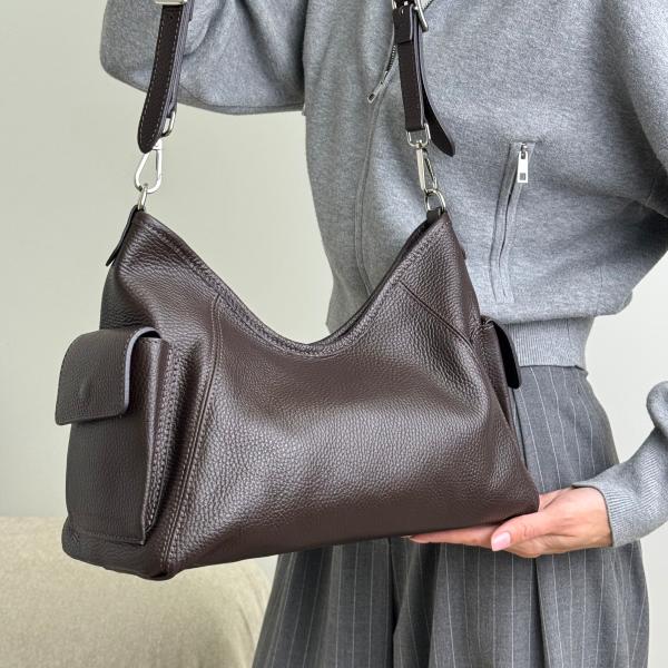 Женская сумочка в стильном шоколадном цвете — элегантная модель из натуральной зернистой кожи, которая сочетает изысканный дизайн и практичность на каждый день. Внутри — два основных отделения, разделённых карманом на молнии, а также дополнительный внутренний карман на замке для удобного хранения мелочей. Снаружи, по бокам, расположены карманы на магнитных кнопках, что делает модель ещё более функциональной. Сумочка застёгивается на молнию и имеет удлинённый ремень для комфортного ношения. Серебристая фурнитура подчёркивает элегантность аксессуара. Приобрести эту стильную кожаную сумочку можно в нашем интернет-магазине — отличный выбор для женщин, которые ценят качество, комфорт и безупречный стиль.