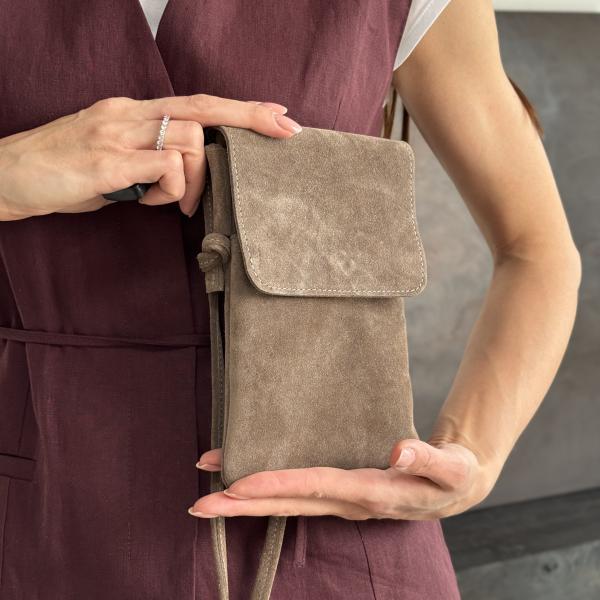 Компактная женская сумочка из натуральной замши в элегантном цвете тауп — изысканное дополнение к вашему повседневному образу. Модель оснащена одним основным отделением, которое надежно закрывается на молнию и дополнительно фиксируется клапаном с магнитной кнопкой. Под клапаном расположено удобное открытое отделение для быстрого доступа к необходимому, а на обратной стороне — внешнее отделение на молнии. Удлинённый ремень позволяет комфортно носить сумочку через плечо. Несмотря на компактные размеры, модель сочетает в себе функциональность, утончённость и комфорт. Доступна в нашем магазине.