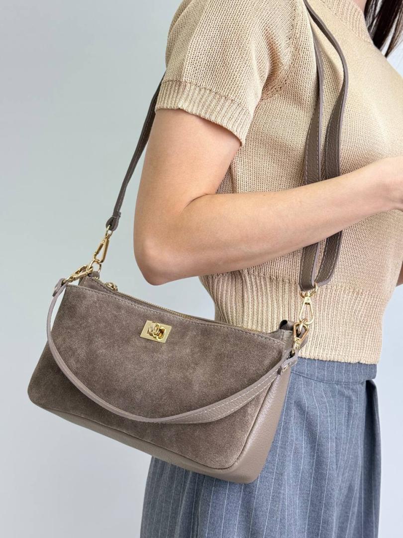 Сумочка в изысканном оттенке тауп — стильное дополнение к вашему образу с эффектным сочетанием фактурной зернистой кожи и мягкой замши. Модель оснащена двумя отделениями: одно закрывается на молнию, другое — на поворотный замок. Внутри предусмотрен дополнительный карман на молнии. Удобная ручка позволяет комфортно носить сумку в руке или на плече, а удлинённый регулируемый ремень — через плечо. Завершающим акцентом служит фурнитура в золотистом цвете. Приобрести эту модель можно в нашем магазине.