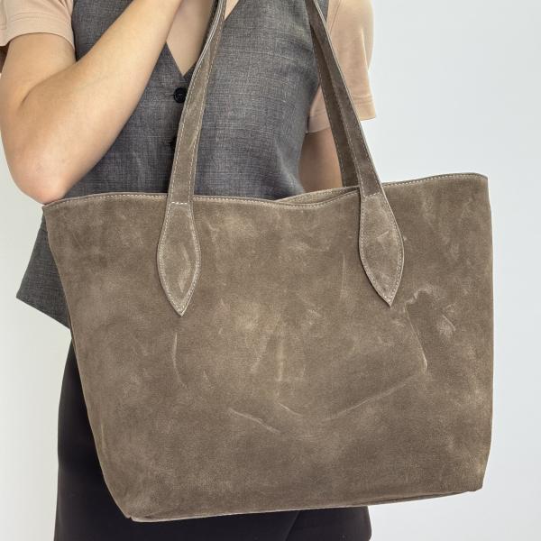 Женская сумочка в изысканном цвете тауп — отличный выбор для тех, кто ценит сдержанную классику. Модель выполнена из мягкой натуральной замши, приятной на ощупь и стильной внешне. Одно основное отделение надежно закрывается на магнит, а внутри расположены два кармана — открытый и на молнии — для удобного хранения мелочей. Удлинённые ручки обеспечивают комфортное ношение как в руке, так и на плече. Сумочка прекрасно дополнит повседневный образ, сочетая в себе элегантность и практичность. Доступна в нашем магазине.