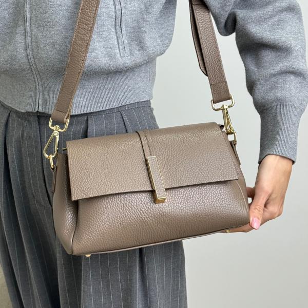 Женская сумочка в элегантном цвете тауп, выполненная из натуральной зернистой кожи, — стильный и функциональный аксессуар на каждый день. Модель имеет три отдельных отделения для удобной организации вещей, а также дополнительный внутренний карман на молнии. Сумка закрывается на молнию и дополнительно фиксируется клапаном с замком, что обеспечивает надежность в использовании. Удлинённый регулируемый ремень позволяет комфортно носить её через плечо или на плече, а золотая фурнитура придаёт изделию изысканный акцент. Приобрести эту универсальную и стильную модель можно в нашем интернет-магазине — отличный выбор для современных женщин, которые ценят качество и внимание к деталям.