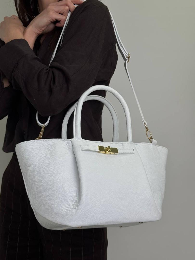 Женская сумка белого цвета из натуральной кожи - идеальный выбор для тех, кто ценит удобство и современный стиль. Её оригинальная форма подчёркивает изысканный вкус. Внутри расположено вместительное основное отделение, а также карманы - на молнии и открытые. Удобные округлые ручки и регулируемый плечевой ремень позволяют носить сумку так, как Вам удобно. Модель полностью застёгивается на молнию, обеспечивая надёжность и комфорт в повседневном использовании.