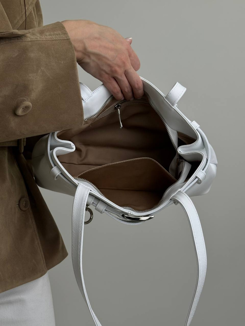 Женская сумочка из натуральной гладкой кожи в белом цвете - элегантный и практичный аксессуар на каждый день. Удлинённая форма, удобные высокие ручки и декоративный ремешок спереди придают модели особый шарм. Внутри - одно основное отделение с функциональными карманами на молнии и без. Белая сумочка станет стильным акцентом в вашем гардеробе. Купите женскую сумку из натуральной гладкой кожи в актуальном белом цвете - сочетание качества и изысканности.
