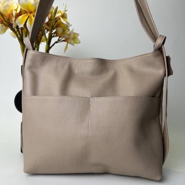 Новинка, сумка из мягкой натуральной кожи в бежевого цвете, это тренд сезона. Под клапаном одно отделения которые закрываются на молнию, также есть дополнительный карман на молнии и без. Сумочку можно носить через плечо, очень практична и удобная модель.