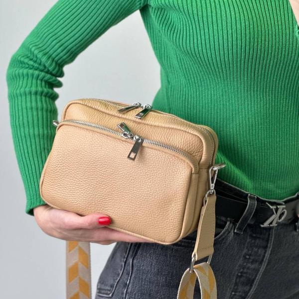 Модная новинка бежевого цвета из натуральной мягкой кожи, на широком ремне, будет радовать вас каждый день. Внутри одно основное отделения закрывается на молнию, также есть дополнительный карман на молнии. Подойдет как на прогулку и на каждый день.