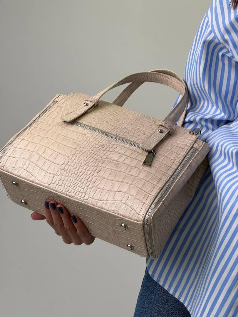 Бежевая сумочка из фактурной натуральной кожи. Имеет средний размер с двумя основными отделами. Так же есть карман по центру на молнии и два не больших кармана по бокам. Молнии со внешней стороны сумочки гармонично дополняют образ как декор. В комплект так же входит еще один кожаный ремешок, который регулируется.