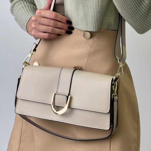 Купить сумку из гладкой натуральной кожи бежевого цвета, отличное решения. Не смотря на размеры эта красотка вмещает все необходимое для нас девушек на каждый день. Внутри сумки одно отделение и дополнительный карман. В комплекте два ремни, короткий и длинный который регулируется.