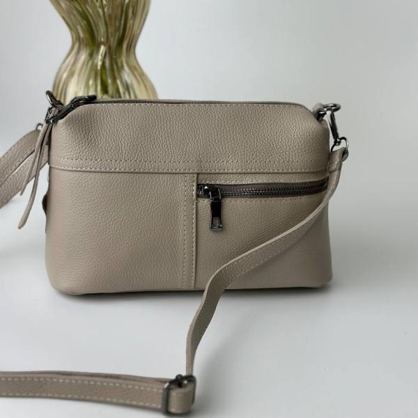 Маленькая женская сумочка из натуральной итальянской кожи бежевого цвета. Сумочка имеет два отдельных основных отделения, которые полностью закрываются на молнию. Внутри отделение есть карман на молнии и без молнии. Спереди и сзади сумочки также есть карманы на молнии, что очень удобно и практично. В комплекте идет стильный плечевой ремень, который регулируется под любую Вам длину. Она очень устойчивая за счет дополнительных ножек. Универсальный вариант сумочки, который подойдет абсолютно под все и на каждый день.