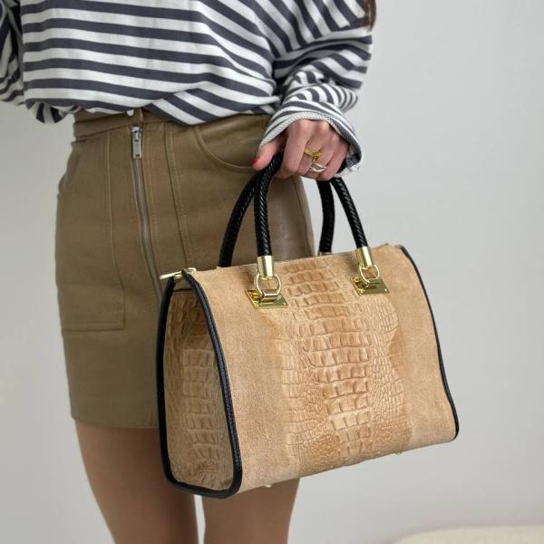 Бежевая женская сумочка из натуральной кожи, а именно замши. Сумочка имеет оригинальную форму. Внутри одно основное отделение. Внутри есть карман на молнии и два кармана без молнии. Фурнитура красивого золотистого цвета. Ручки в данной модели нестандартные, плотные и закругленные, что придает большой комфорт в ношении. Дополнительно есть ремень. Его можно легко регулировать и носить на плече или же через плечо. Очень удобная и стильная сумочка, которая подойдет каждой представительницы прекрасного пола.