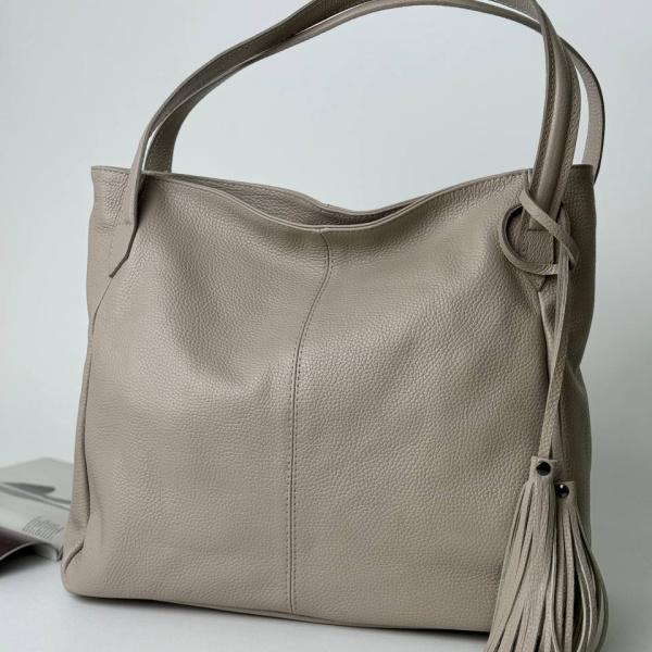 Большая и нежная модель сумки что поместить в себе все необходимое на каждый день. Модель имеет очень приятный бежевый цвет. Сумка полностью закрывается на молнию. Внутри два основных отделение, которые разделяет карман на молнии. А также есть дополнительные карманы на молнии и без. Практичная модель, которую можно носить как на плече так и в руках.